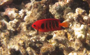 This is a difficult fish to film. Not only are they rare on the reef (have only seen one during my 300 dives out here), but they are also great at dancing and dodging into & out of the reef at a rapid pace, seldom holding still to flaunt the beautiful reds, yellows & turquoises their mammas gave them. Despite their nymph-like agility, patience paid off and I final captured a few decent shots of this remarkable fish. These are prime targets for aquarium collectors, but I’m glad this little guy has escaped their nets thus far.